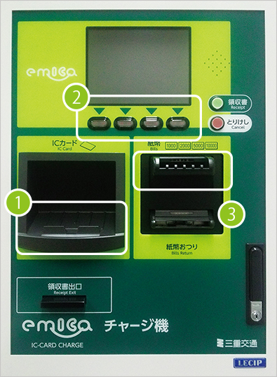 emicaはプリペイド式(前払い式)ICカードです。チャージした分だけバスに乗ることができます。カード内の残額が少なくなっても繰り返しチャージしてご利用いただけます。三重交通営業所、emicaチャージ対応窓口、emicaチャージ機、バス車内でチャージできます。チャージ(入金)の上限は35,000円です。